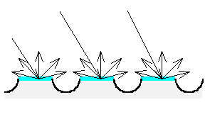 Obrázek -A : Svazek rovnoběžných paprsků dopadá na optickou mřížku a každý bod neporušeného povrchu mřížky je zdrojem kulové vlny, což je znázorněno rozbíhavými paprsky. Pro jev interference je důležité sledovat paprsky mající stejný směr.
