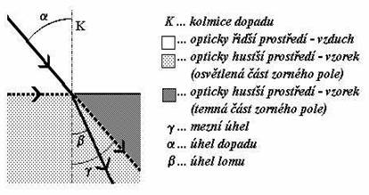 Podstatou měření je zjišťování mezního úhlu lomu, jenž je dán polohou rozhraní mezi osvětlenou a temnou částí zorného pole (obr. 1), odečítanou na stupnici přístroje (obr. 2).