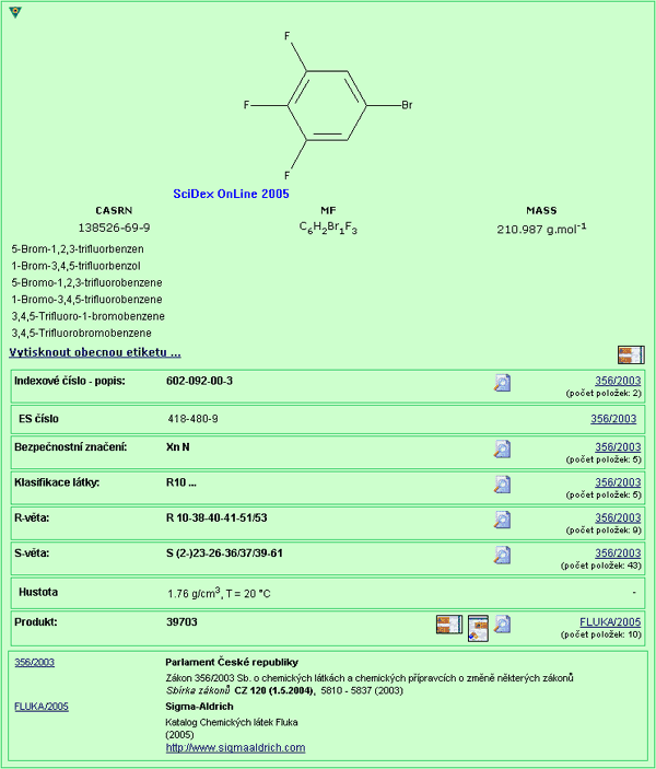 Toxikologická databáze chemických látek TOXI ON-LINE je určena pro práci s nebezpečnými chemickými látkami prostřednictvím Internetu. Databázi můžete použít zejména pro zpracování bezpečnostních listů chemických produktů, značení chemických látek - tisk etiket s bezpečnostními symboly, R-věty, S-věty, ADR/RID atd.