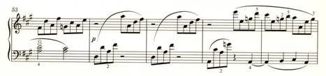 v 54. takte sa síce dosiahne tónina terciovej príbuznosti D dur, ale ďalší