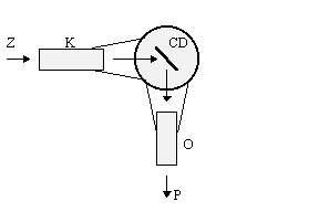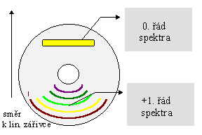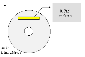 Obrázek -F :Schematické znázornění 0. a +1. řádu emisního spektra na kompaktním disku. Pohled shora. Oko se nachází nad +1. řádem spektra ve vzdálenosti asi 5 cm od disku.
