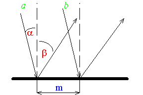 Obrázek -A : Svazek rovnoběžných paprsků dopadá na optickou mřížku a každý bod neporušeného povrchu mřížky je zdrojem kulové vlny, což je znázorněno rozbíhavými paprsky. Pro jev interference je důležité sledovat paprsky mající stejný směr.
